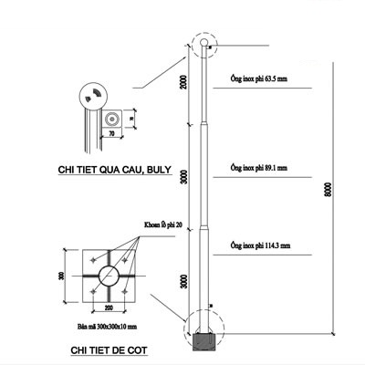 – Đế cột: Bản mã inox 300x300x10 mm. Có 4 tăng cứng inox hình tam giác. Khoan 4 lỗ phi 20 mm